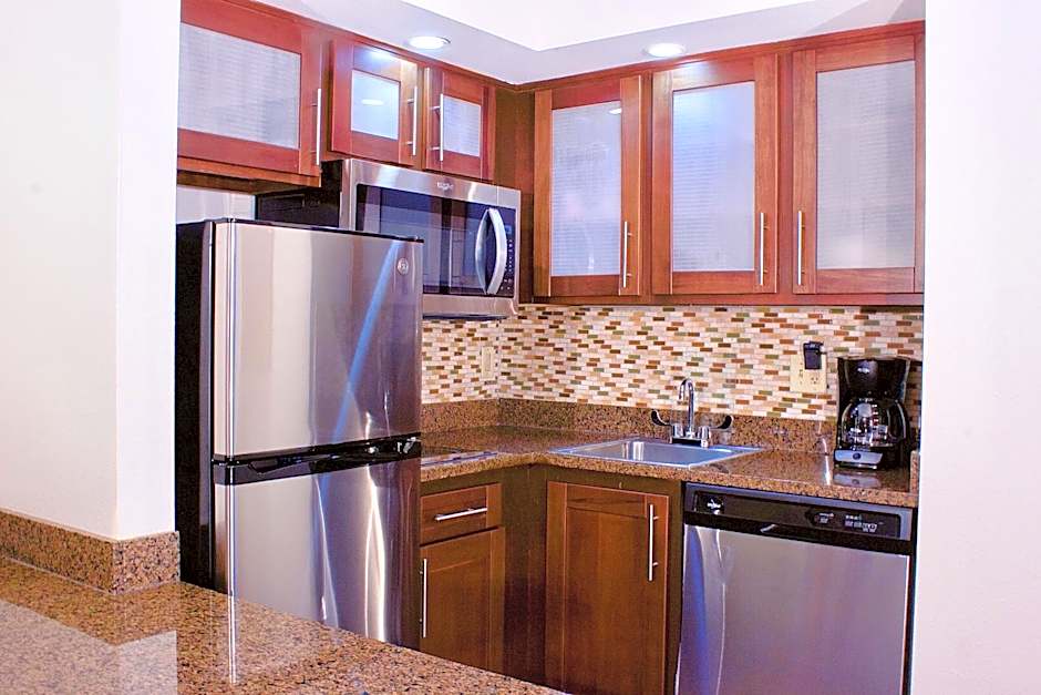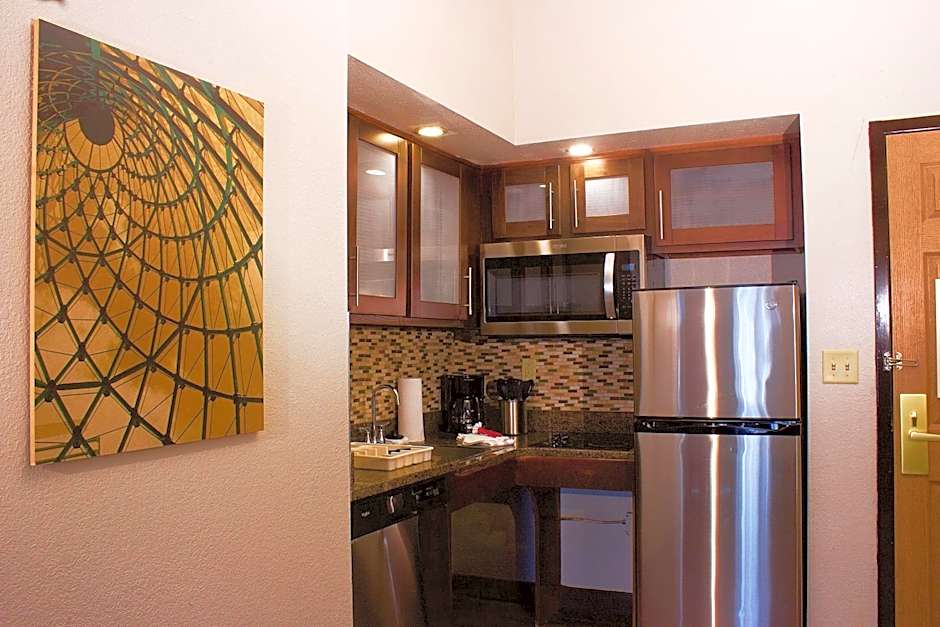 This suites features a full kitchen with a full sized refrigerator, stove top burner, dishwasher, microwave, and coffee machine.