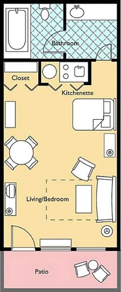 This studio includes a double Murphy bed, a queen sleeper sofa, microwave, and cable TV.