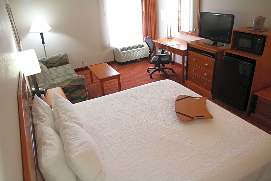 32-inch HDTV, free WiFi, work desk, coffeemaker, two easy chairs Unwind in this welcoming room with one king clean and fresh Hampton bed®. Relax watching the 32-inch LCD HDTV or stay on top of business at the desk. Keep up-to-date with free WiFi. This room also has a coffeemaker and two easy chairs. The bathroom includes a shower with a curved rod, that allows for more space and light.