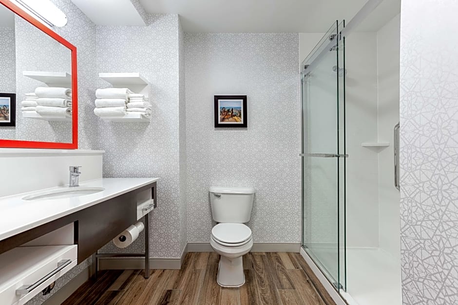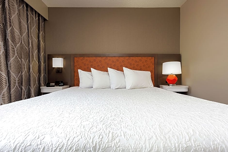 This mobility and hearing accessible, non-smoking room features one king-sized bed, and an accessible roll-in shower. The room also has a visual alarm and notification devices for the doorbell or door knock and incoming phone calls. The room features comfortable soft seating, a HDTV, and easy to operate alarm clock/radio. The free WiFi access will help you stay connected while on the road. If you prefer not to work at the desk, you can use the convenient lapdesk instead. You'll also enjoy the convenience of having a coffeemaker and iron/ironing board in your room.