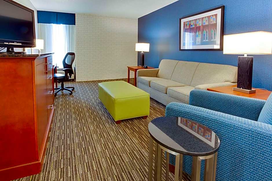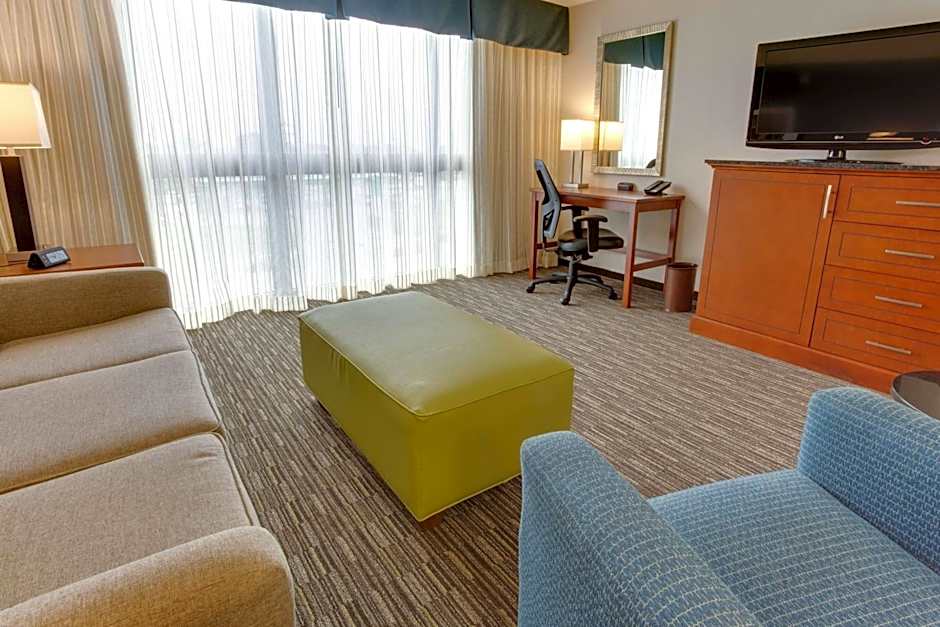 This suite features a seating area with a sofa bed, flat-screen cable TV, and desk with an ergonomic chair.