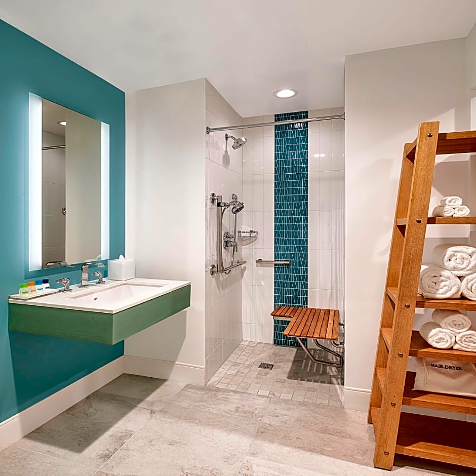 This accessible room is set up to allow for mobility and comfort featuring one King Bed dressed in custom, luxurious all-white linens and premium bedding. Contemporary furnishings and a soothing sand, sea and sky color palette create the perfect setting for relaxation after a day in Music City. **Can connect to B2Q** **Please do not confirm connecting room requests** Accessibility features include: Hearing accessible visual fire alarms, phone light Wide entry door Accessible vanity Grab bars Roll in Shower with bench Amenities include: One King Bed Mini-fridge Keurig Coffee Maker A/C individually controlled in room In room Safe Iron & ironing board Bathroom Private bath with shower Margaritaville custom branded bath amenities Hairdryer Makeup mirror Technology 55” LCD Smart TV Free High-Speed Internet USB ports In-room entertainment package Alarm clock radio