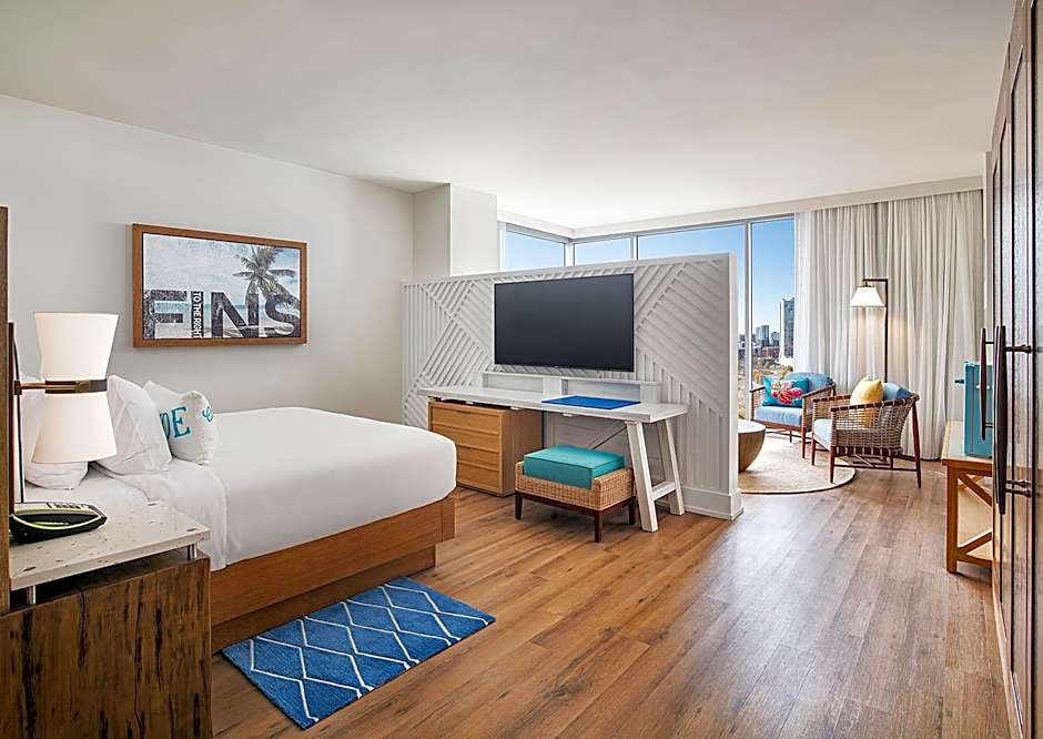 Nothing says paradise like a luxurious suite situated right in the middle of the capital of country music. This expansive, accessible one-bedroom suite features a contemporary design with comfortable furnishings. A soothing sand, sea and sky color palette provides the perfect Margaritaville. The living room boasts a queen-size sofa bed. Living room space not fully separated from bedroom area. The King size bed with luxurious, all-white linens and premium custom bedding guarantees an excellent rest after a day of excitement. **Can connect to B2Q** **Please so not confirm connecting room requests** Accessibility features include: Hearing Accessible visual fire alarms phone light Wide entry door Accessible vanity Grab bars Roll in shower with bench Amenities include: One King Bed Mini-fridge Keurig Coffee Maker A/C individually controlled in room In room Safe Iron & ironing board Bathroom Private bath with shower Margaritaville custom branded bath amenities Hairdryer Makeup mirror Technology 55” LCD Smart TV Free High-Speed Internet USB ports In-room entertainment package Alarm clock radio