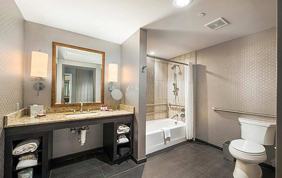 This accessible room offers a flat-screen cable TV, walk-in shower and compact refrigerator. A single-cup coffee maker and ironing facilities are provided. The bathroom offers dimming lighting, a hair dryer and luxury toiletries. Accessible amenities include an adapted bathroom with safety grab bars.