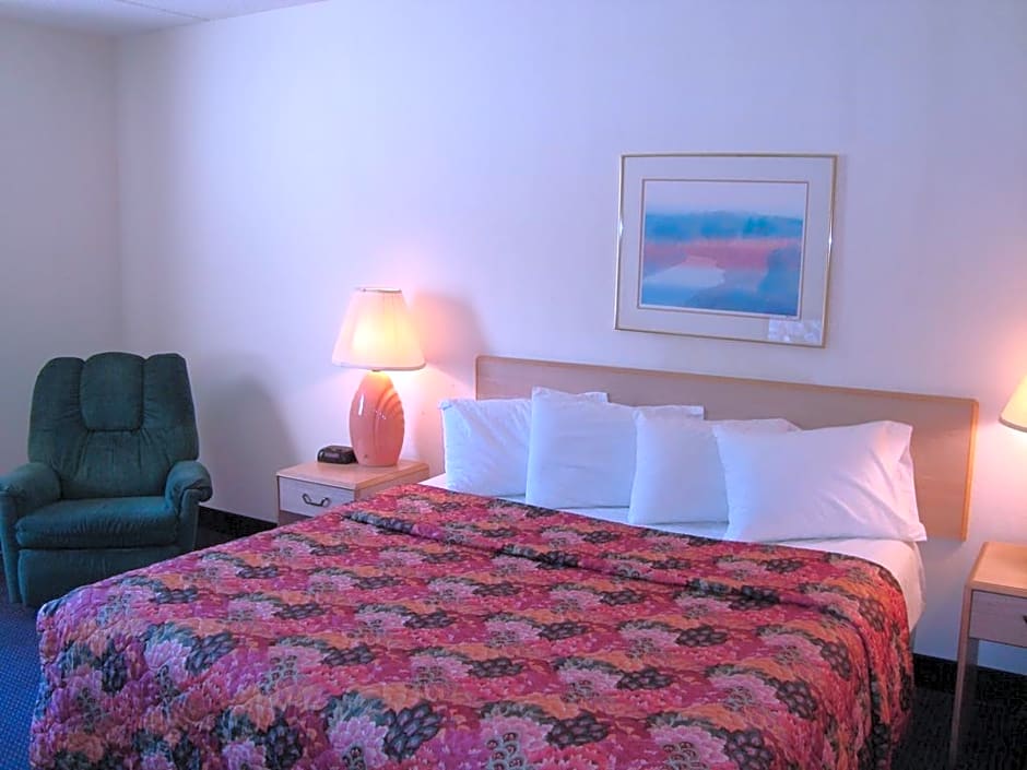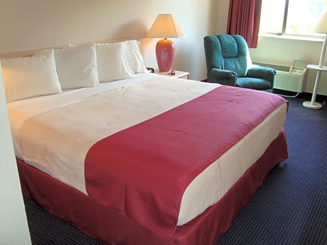 The King Suite feautres a pillow top king bed along with a recliner and sofa. The room also includes a refigerator and microwave.