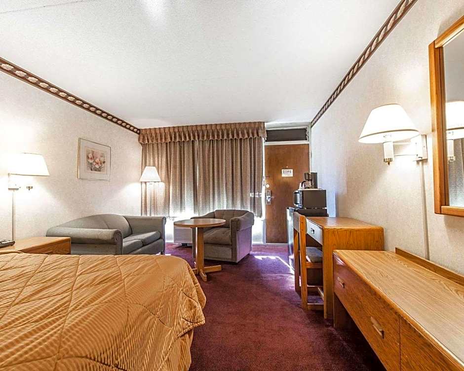 The Rodeway Inn hotel offers a variety of room types including Triple rooms with a King size bed and a sofa bed, Double rooms with two Double beds, King rooms with King size beds, Quadruple rooms with two Queen size beds, and Quadruple rooms with two Double beds. All rooms are non-smoking and have different capacities, accommodating between 2 and 4 adults with or without children.