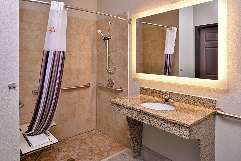 Free high-speed WiFi, free breakfast, bathtub/shower combination, bathtub grab bars, adjustable hand-held shower wand, bathroom is wheelchair accessible, portable bathtub seat, raised toilet seat with grab bars, bedroom is wheelchair accessible, closet rods at wheelchair height, closed caption TV, Visual Emergency Alarms, Flashing Door Knockers, mini-refrigerator, microwave, air conditioning, coffee/tea maker, hair dryer, HDTV, bathroom amenities, alarm clock, desk, iron, ironing board