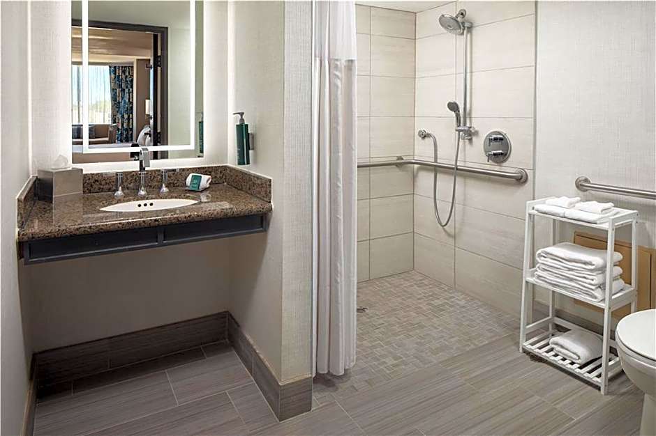 This mobility and hearing accessible deluxe room features one king-sized bed, and a roll-in shower. The room also has a visual alarm, and notification devices for the doorbell or door knock and incoming telephone calls. Each guest room offers a 42-inch flat-screen HDTV with 60 HD channels and 45 HD music channels, mini-refrigerator, laptop safe, work desk, two-line phones with voicemail, coffeemaker, iron, ironing board, and hair dryer. Featuring luxurious bath amenities. Any corresponding photo may not reflect the specific accessible room type or room feature.