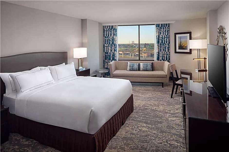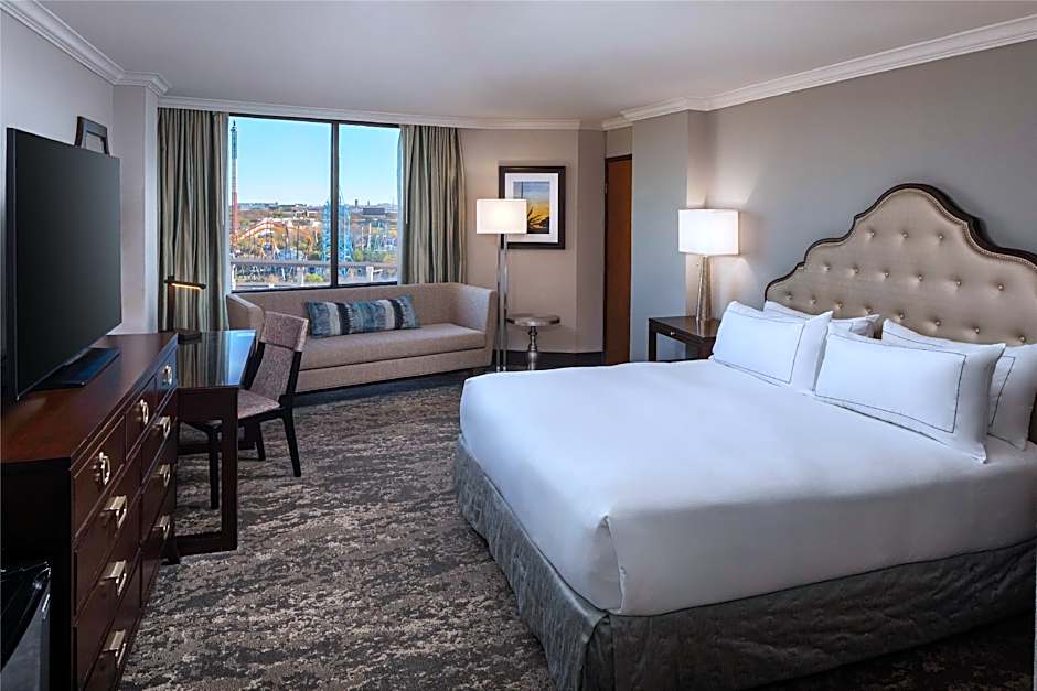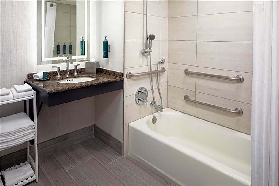 This mobility and hearing accessible standard room features one king-sized bed, and an accessible tub. The room also has a visual alarm, and notification devices for the doorbell or door knock and incoming telephone calls. Each guest room offers a 42-inch flat-screen HDTV with 60 HD channels and 45 HD music channels, mini-refrigerator, laptop safe, work desk, two-line phones with voicemail, coffeemaker, iron, ironing board, and hair dryer. Featuring luxurious bath amenities. Any corresponding photo may not reflect the specific accessible room type or room feature.