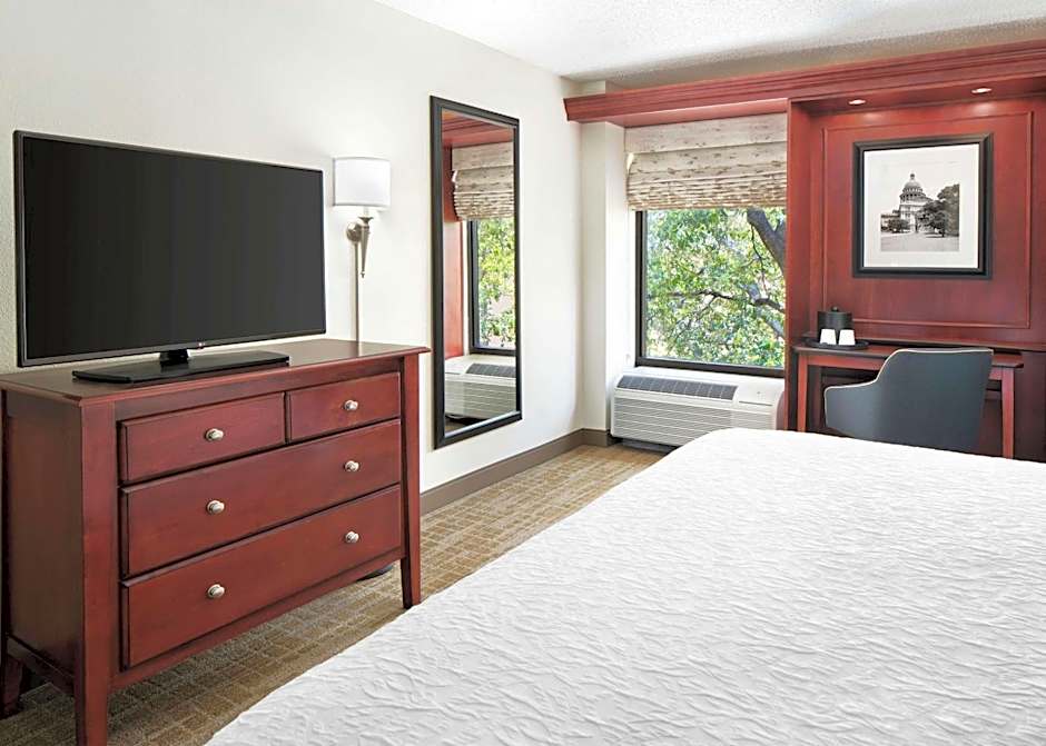 The Hampton Inn Austin North offers a variety of room options. They have King Rooms with a non-smoking policy, Triple occupancy, and a King size bed. They also have Queen Rooms with Two Queen Beds, also non-smoking, with Family occupancy and 2 Queen size beds. Additionally, they offer a Queen Room with Tub, which is accessible and non-smoking, with Triple occupancy and a Queen size bed. Finally, they have a King Studio with a Sofa Bed, non-smoking, with Quadruple occupancy and a King size bed plus a Sofa Bed.