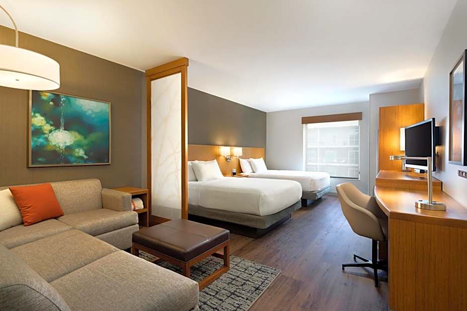 At Hyatt Place Austin Downtown, the hotel offers various types of rooms. These include a Queen Room with Two Queen Beds and Sofa Bed on the high floor, a Queen Room with Two Queen Beds and Sofa Bed, a Corner King Room with Sofa Bed and View, a King Room with Sofa Bed on the high floor, and a King Room with Sofa Bed. Smoking is not allowed in any of these rooms. Occupancy varies, with some rooms accommodating up to 5 adults and 4 children, and others accommodating up to 4 adults and 3 children. The room sizes range from 366 sqft to 420 sqft.