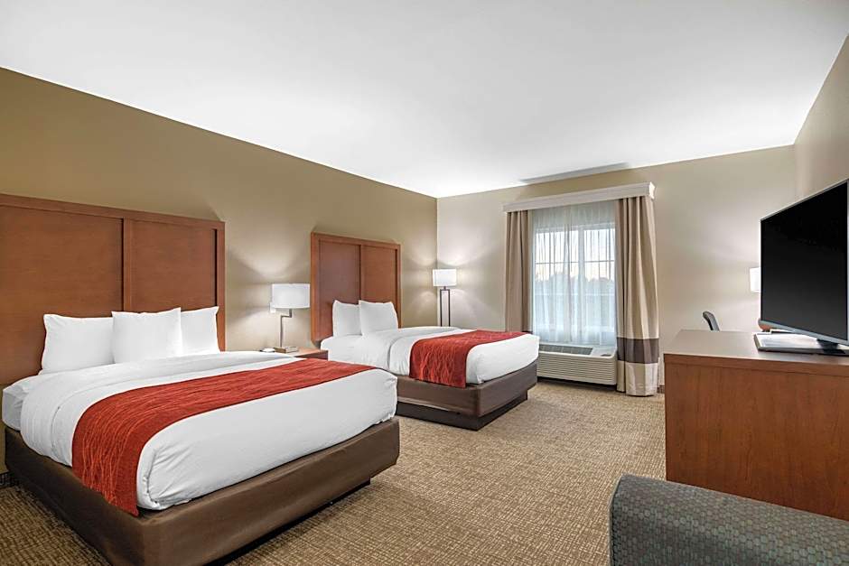 The Comfort Inn & Suites Cedar Hill Duncanville offers a variety of room types including suites and standard rooms. All rooms are non-smoking. The suite options include a Queen Suite with Two Queen Beds and a King Suite, both accommodating up to 2 adults and 1 child. There are also Queen Rooms with Two Queen Beds available, accommodating up to 4 adults and 3 children. The accessible/non-smoking options include a Quadruple room and a King room. Room sizes are approximately 205 sqft for standard rooms and 301 sqft for suites.