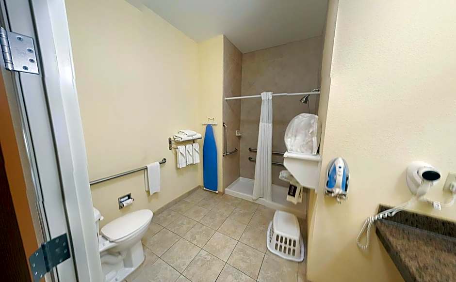 1 Bdrm Ste Comm Access Trans Shwr 1 Qn is 301 square feet and includes a queen-size bed 150-154 width and is Wheelchair-accessible.