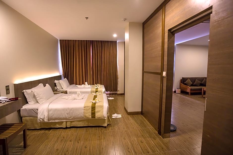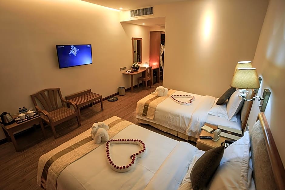 Room options range from the 302 sq ft Superior Twin with a twin bed to the 323 sq ft Deluxe Twin, both designed for 2 adults and 1 child. A 301 sq ft King Room offers a comfortable king bed, and there are multiple two-queen configurations that sleep four. For a scenic stay, the Quadruple Room with Sea View provides a sea-facing option, while the Club Deluxe offers 345 sq ft of space for a little extra room to spread out.