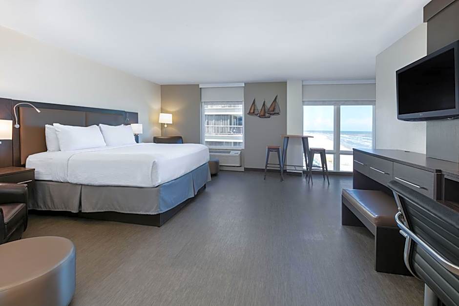 The types of rooms available at Wyndham Corpus Christi Resort North Padre Island include King Rooms with either a roll-in shower or a bathtub, King Suites with city view or ocean view, Suites with two Queen beds and ocean view or city view, and a Family Suite with two King beds and ocean view. Smoking is not allowed in any of the rooms. The rooms can accommodate various numbers of adults, ranging from 2 to 5 adults, and have bed sizes of either King or Queen.
