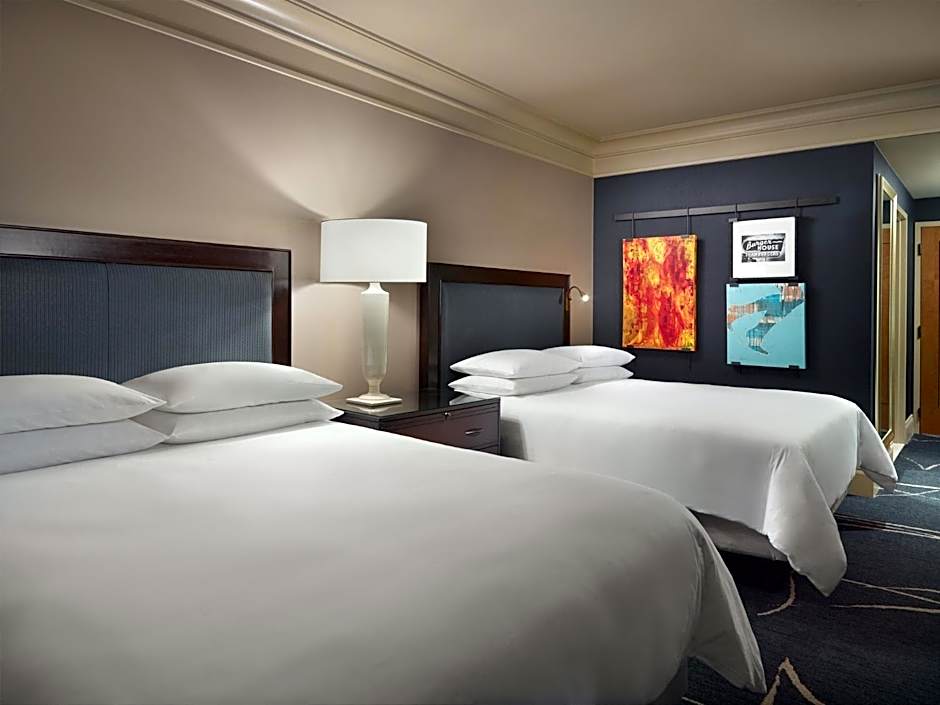 Premier Room - 2 Queen Beds - Luxuriously appointed with warm colors and floor-to ceiling windows, this room offers panoramic city views from a high floor. Beds feature fine linens, plush duvets and luxury pillows. The guest bathroom is equipped with a bathtub or walk-in shower, functioning drawers and a television hidden in the mirror.