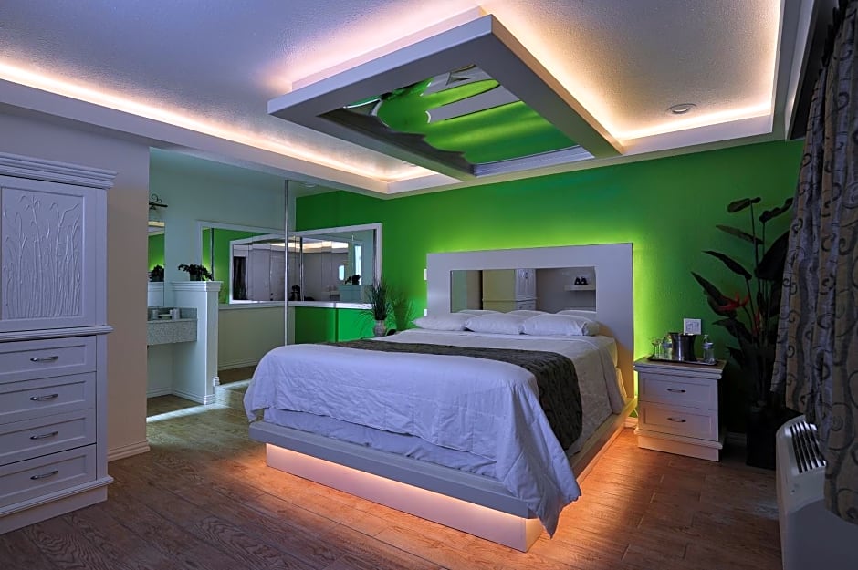 Featuring a spa bath and a mirrored ceiling, this room welcomes you with complimentary champagne, water bottles, chips and mints.Custom beds that emit soft lighting are provided. A refrigerator and a seating area with a leather sofa chair are provided. The flat-screen cable TV includes access to Cinemax and HBO film channels.