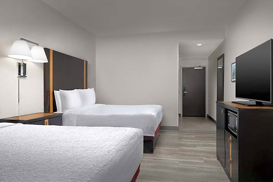 This mobility accessible, non-smoking room features two queen-sized beds featuring our clean and fresh Hampton bed. The bath is equipped with accessible bathtub. The room features comfortable soft seating, microwave, refrigerator, a 47-inch HDTV, and easy to operate alarm clock/radio. The free WiFi access will help you stay connected while on the road. If you prefer not to work at the desk, you can use the convenient lapdesk instead. You'll also enjoy the convenience of having a coffee maker with tea service and iron/ironing board in your room. Any corresponding photo may not reflect the specific accessible room type or room feature.