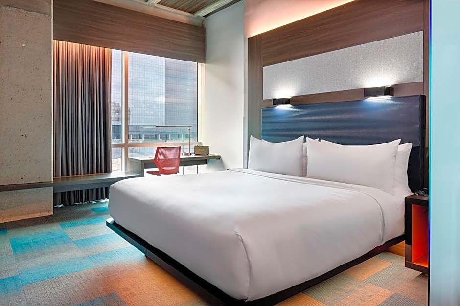 The Aloft Fort Worth Downtown hotel offers a variety of room options. There are Ultra Savvy Suites with either 1 King or 2 Queen beds, a sofa bed, and a corner room. The regular Aloft Guest rooms also come with either 1 King or 2 Queen beds. The Savvy Suite has 1 King bed and a sofa bed. Smoking is not allowed in any of the rooms. Room sizes range from 291 sqft to 764 sqft, and the accommodations range from 2 adults with 1 child to 6 adults with 5 children.