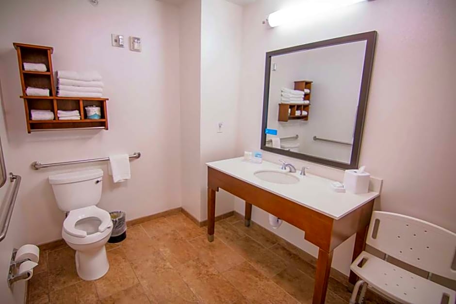 This mobility and hearing accessible, one-room, non-smoking studio features one king-sized bed featuring our clean and fresh Hampton bed. The bath is equipped with accessible roll-in shower. The suite also has a visual alarm and notification devices for the doorbell or door knock and incoming phone calls. The room features include a microwave, refrigerator, wet bar, comfortable soft seating, a HDTV, and easy to operate alarm clock/radio. The free WiFi will help you stay connected while on the road. If you prefer not to work at the desk, you can use the convenient lapdesk instead. You'll also enjoy the convenience of having a coffeemaker with tea service and iron/ironing board in your room. Any corresponding photo may not reflect the specific accessible room type or room feature.