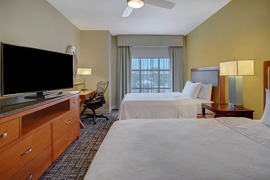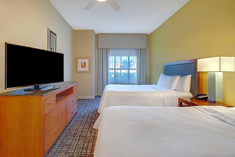 Our accessible, two-bedroom (1 King/2 Queens, 1,062 sq. ft.) non-smoking suite features spacious bedrooms with king and double queen floor plans, full-sized bathrooms with grab bars. Alarm clocks offer MP3 player ports, and bedrooms feature a separate LCD HDTV. Relax in a separate living area with a full-sized sofa bed, cordless telephone with voicemail, LCD HDTV with complimentary premium HD channels, and work desk with extra outlets and chair. The fully-equipped kitchen includes full-sized appliances and place settings for four. Complimentary high-speed wireless internet access keeps everyone connected. Accessible amenities include handrails in bathtub and toilet area, roll-in shower, hand held showerhead, lowered peep hole, visual alert for telephone call and message indicator. Suite also features fire alarm with horn and strobe lights and a visual door announcer. Any corresponding photo may not reflect the specific accessible room type or room feature.