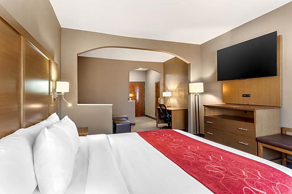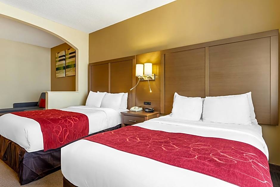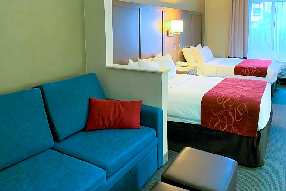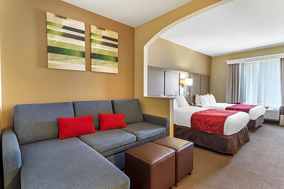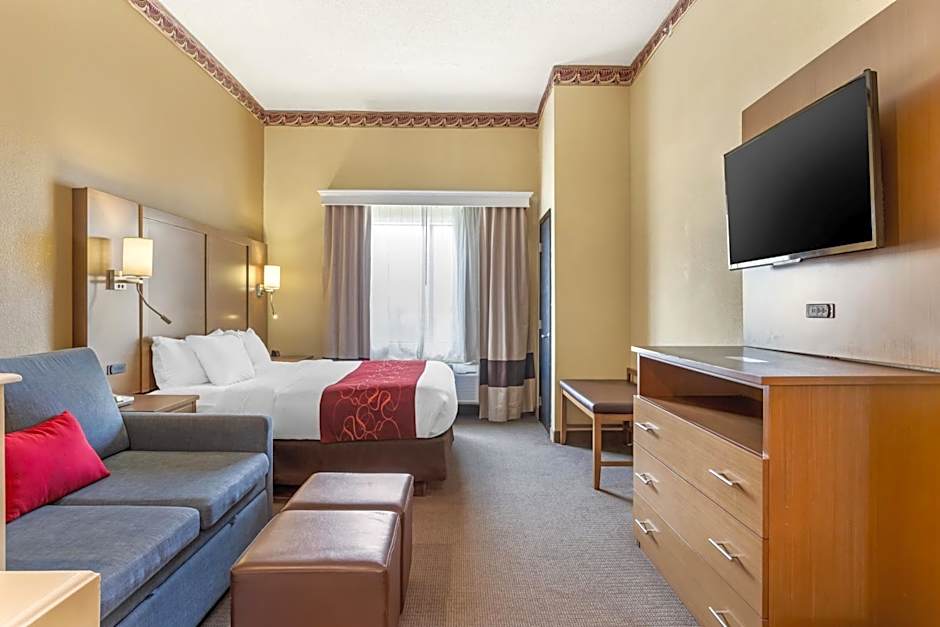 The Comfort Suites Bush Intercontinental Airport offers a variety of room types including King Suites, Double Suites, and Standard King Suites. The rooms are non-smoking and have a room size of 441 sqft. Occupancy ranges from 2 adults and 1 child to 5 adults and 4 children. The bed options include king size beds, double beds, and sofa beds.