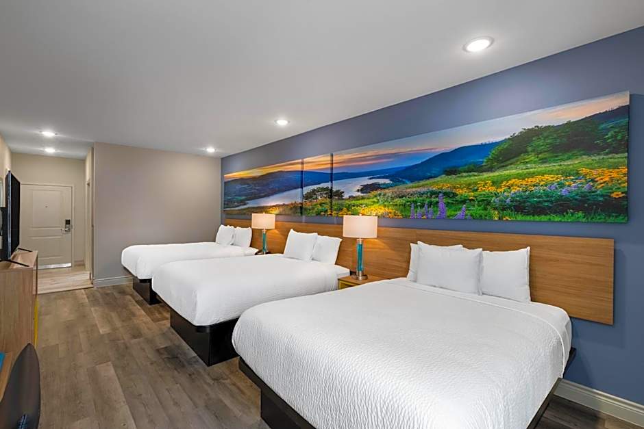 The hotel offers a variety of room types including Queen Rooms with Two Queen Beds, Queen Rooms with Three Queen Beds, King Rooms with Mobility/Hearing Access Tub w/ Grab Bars, and King Rooms. All rooms are Non-Smoking. The Queen Rooms with Two Queen Beds and King Rooms have a room size of 377 sqft and can accommodate 2 adults and 1 child. The Queen Room with Three Queen Beds has a larger room size of 484 sqft and can accommodate 6 adults and 4 children.