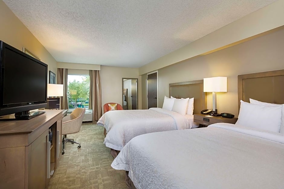 Easy chair, walk-in shower, refrigerator, microwave, desk, 42-inch TV, free WiFi Relax in this double room with two clean and fresh Hampton beds®. Sink into the easy chair with ottoman and watch movies on the 42-inch HDTV. Surf the web with free WiFi. Catch up with work at the large desk with ergonomic chair. Refresh your senses in the bathroom, complete with walk-in shower and plush towels. Enjoy the convenience of having a refrigerator, microwave and coffeemaker in the room. Sleeps 4.