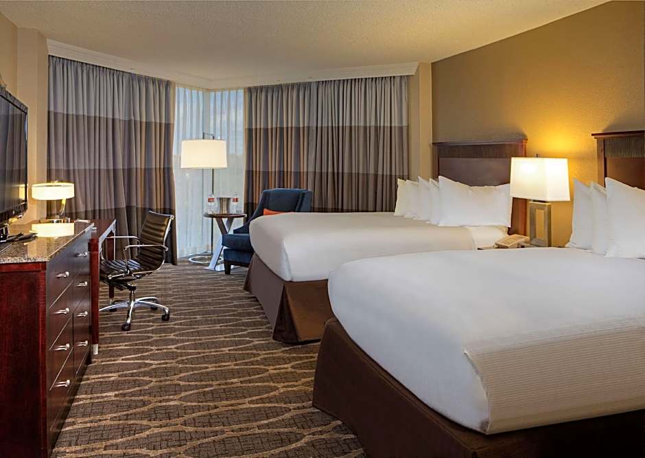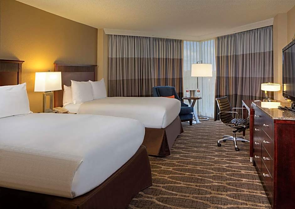 Executive benefits, Complimentary breakfast, Floor-to-ceiling windows, Workstation & Ergonomic chair, Sofa, Armchair & Ottoman, WiF, Refrigerator Relax in this bright, stylish room and enjoy the panoramic views through our floor-to-ceiling windows. As an Executive Level guest, enjoy premium benefits including complimentary continental breakfast and evening hors d'oeuvres. Stay organized with access to the Executive Level's business center with conference room. Watch your favorite movies On-Demand in our armchair and ottoman. Keep up with work while on the road at our full-sized workstation with specially designed ergonomic chair. Guest bath features curved shower curtain rods, deluxe showerheads, oversized mirrors and granite counters The two double Hilton Serenity beds feature luxurious, allergen-free down comforters and pillows, high thread count sheets and crisp white duvet covers, plus a mattress set custom designed for added support and comfort.