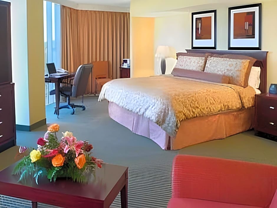 Executive benefits, Complimentary breakfast, Living area, Dining table, Floor-to-ceiling windows, Marble bathroom, Workstation & Ergonomic chair, WiFi, Refrigerator Relax in this bright, elegantly designed, oversized premiere suite with panoramic views from our floor-to-ceiling windows. Executive Level guests enjoy a variety of premium benefits including complimentary continental breakfast, evening hors d'oeuvres, and access to the Executive Level's business center with conference room. Watch your favorite movies On-Demand in our armchair and ottoman. Keep up with work at our full-sized workstation with ergonomic chair. Guest bath features marble floors and granite counters, marble shower with oversize deluxe showerheads and whirlpool tub. The king Hilton Serenity bed features luxurious, allergen-free down comforter and pillows, high thread count sheets and crisp white duvet cover, plus a mattress set custom designed for added support and comfort.
