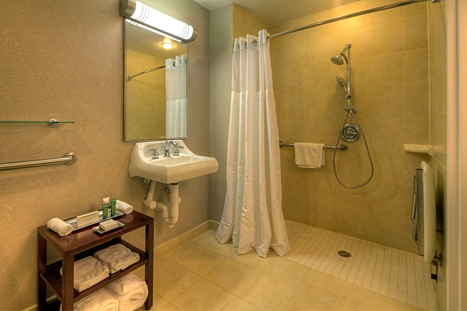 This mobility and hearing accessible standard room features one king-sized bed, and a roll-in shower. The room also has a visual alarm, and notification devices for the doorbell or door knock and incoming telephone calls. Any corresponding photo may not reflect the specific accessible room type or room feature.