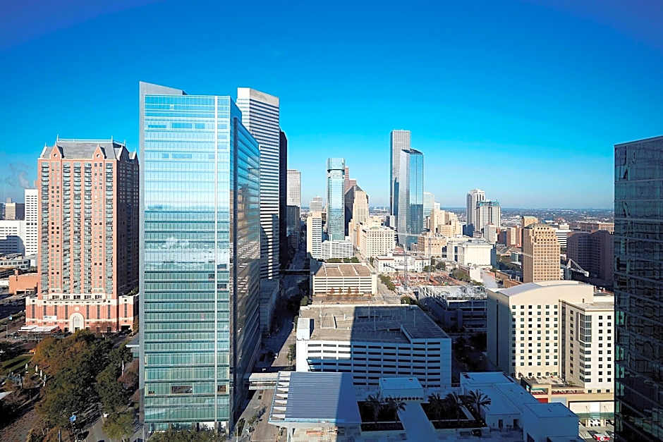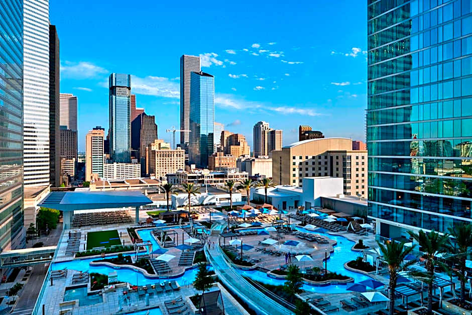 It has a view of Discovery Green Park or the Texas-shaped lazy river.
