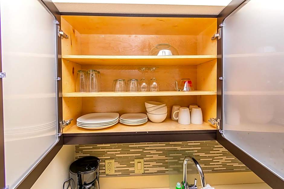 1 Queen Studio Suite Top Floor is 280 square feet and includes a queen-size bed 150-154 width and is Wheelchair-accessible.