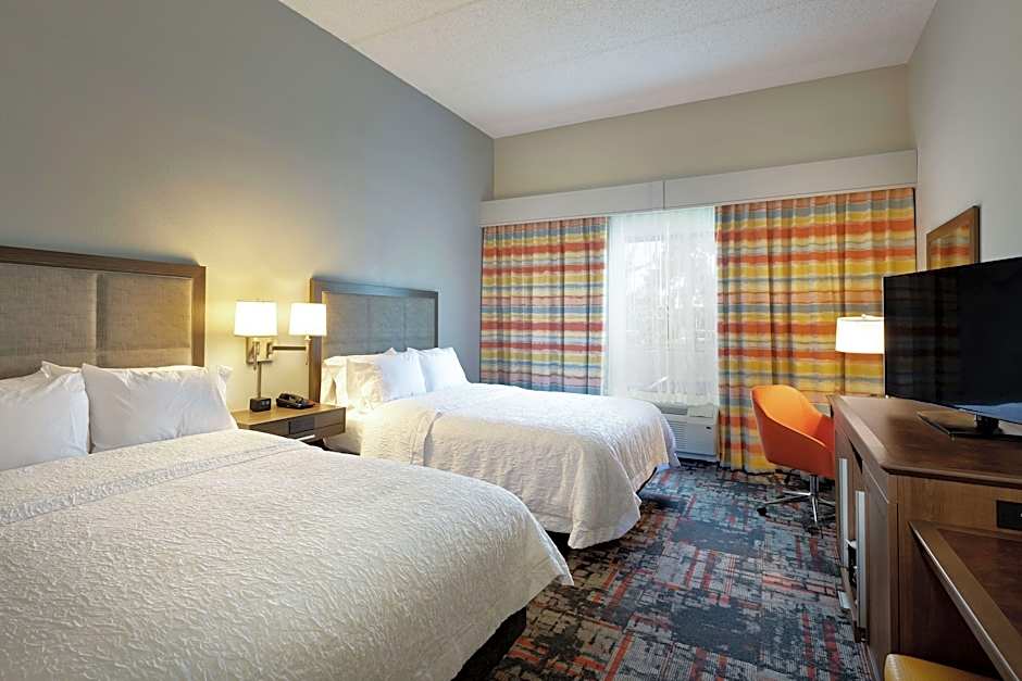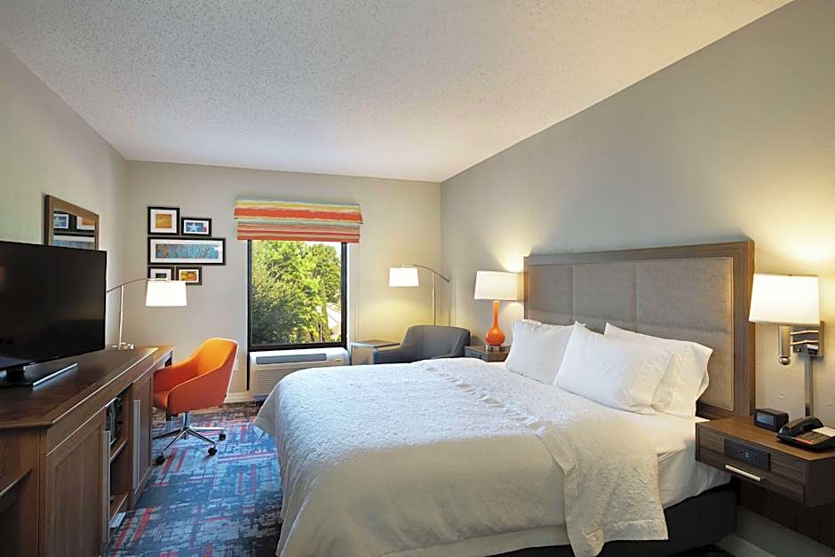 32-inch HDTV, whirlpool, free WiFi, work desk, coffeemaker Unwind in this welcoming room with one king clean and fresh Hampton bed®. Relax on the easy chair watching the 32-inch LCD HDTV or stay on top of business at the desk. Keep up-to-date with free WiFi. This room also has a coffeemaker. The bathroom includes a shower with a curved rod, that allows for more space and light, and a soothing whirlpool tub.