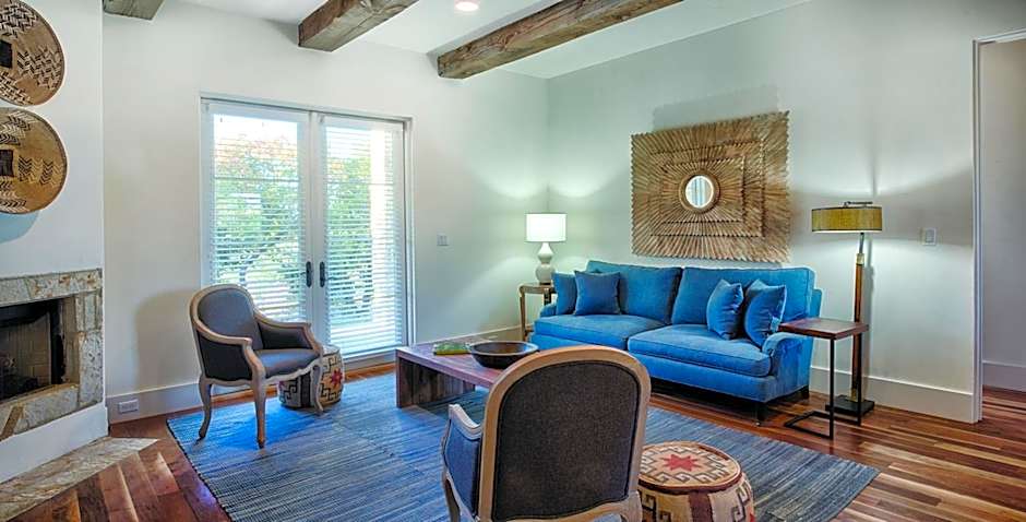 This villa features a living room with a gas fireplace, a fully equipped kitchen, and outdoor dining area.