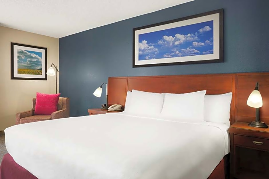 This mobility accessible standard room features one king-sized bed, and a roll-in shower. The room also has a visual alarm, and notification devices for the doorbell or door knock and incoming telephone calls. In addition, the spacious king-sized bed accessible rooms feature Sweet Dreams by DoubleTree Sleep Experience linens, duvet and bolster pillow, luscious bath amenities and an alarm clock with MP3 compatibility. Each of our guest rooms also features extended counter space/workdesk area, 32-inch flat-screen television, telephone and WiFi access. Other comforts of home include a coffeemaker, mini-fridge, microwave, hairdryer and iron/ironing board. Any corresponding photo may not reflect the specific accessible room type or room feature.