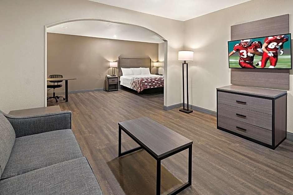 Red Roof Inn & Suites Irving - DFW Airport South offers a variety of rooms including Two Room Suites and Double Rooms. Occupancy ranges from accommodating 2 to 4 adults per room, without children. Bed options include King beds, Double beds, and Sofa beds across different room types, but all rooms are non-smoking and of varying sizes.