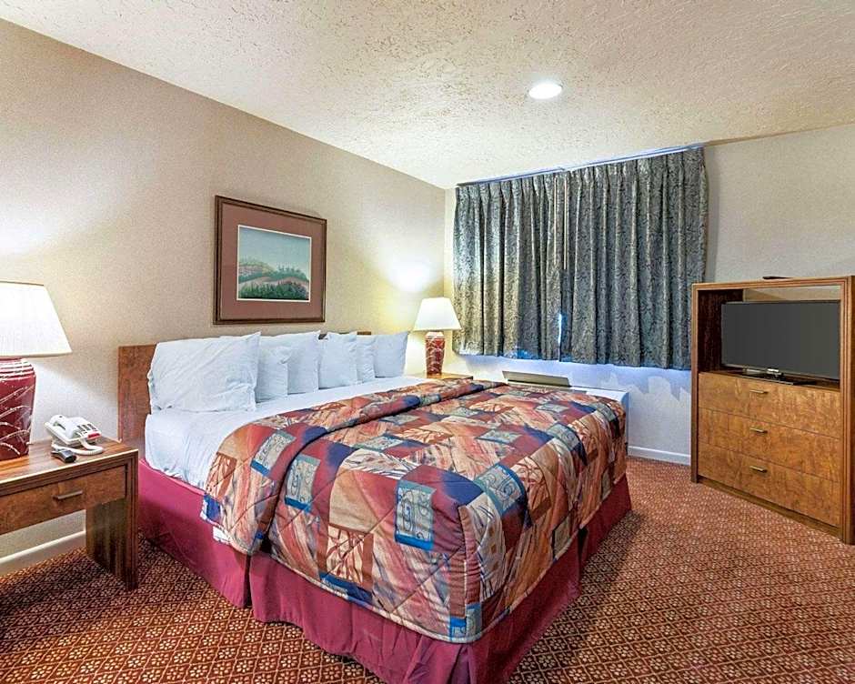 Rooms at the Rodeway Inn include 1 King Bed, 2 Double Beds, Standard, Standard Suite, 2 Queen Beds, Mountain View, and various King Bed Suites. Occupancy ranges from accommodating 2 adults and 1 child to 4 adults and 3 children. Some rooms allow smoking, while others are strictly non-smoking. Bed sizes vary between King and Queen beds, and room sizes are around 301 sqft for the mentioned rooms.