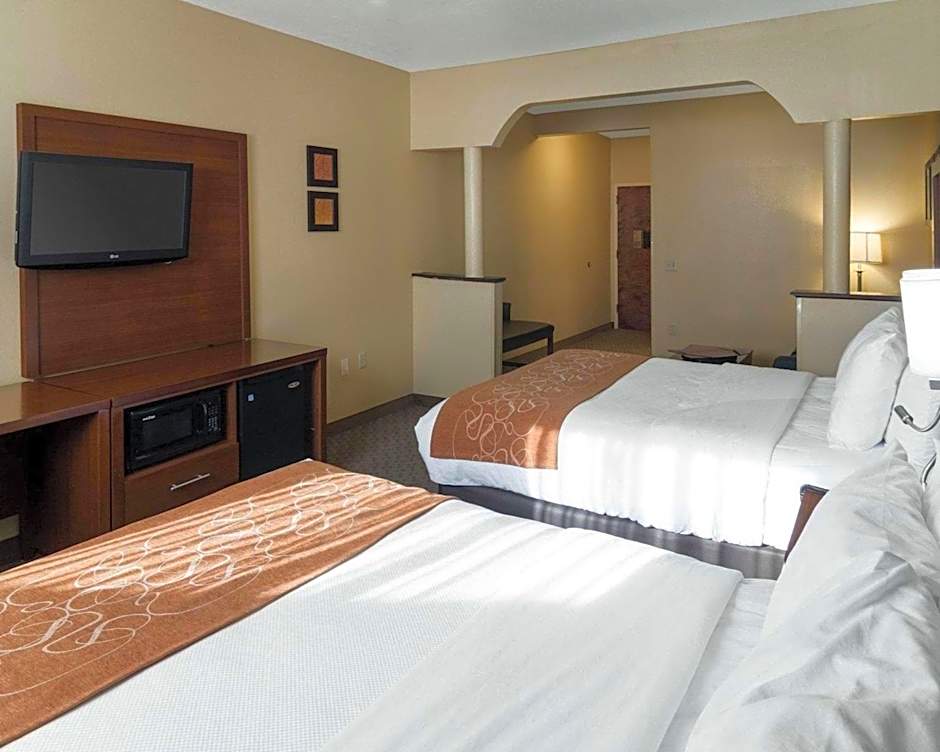 The Quality Suites Midland offers various types of suites including Queen Suites with Two Queen Beds - Non-Smoking, King Suites - Non-Smoking, Suite with Two Queen Beds - Accessible/Non-Smoking, King Suite - Accessible/Non-Smoking, and King Suites with Whirlpool Bath - Accessible/Non-Smoking. All rooms have a size of 355 sqft and smoking is not allowed. The Queen Suites accommodate 4 adults and 3 children, while the King Suites accommodate 2 adults and 1 child. The beds provided are either 2 Queen size beds or 1 King size bed.