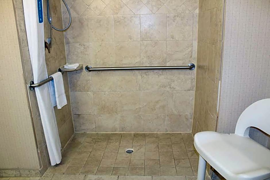 This mobility and hearing accessible, non-smoking room features one king-sized bed, and an accessible bathtub. The room also has a visual alarm and notification devices for the doorbell or door knock and incoming phone calls. The room features comfortable soft seating, microwave, refrigerator, a HDTV, and easy to operate alarm clock/radio. The free WiFi access will help you stay connected while on the road. If you prefer not to work at the desk, you can use the lapdesk instead. You'll also enjoy the convenience of having a coffeemaker with tea service and iron/ironing board in your room. Any corresponding photo may not reflect the specific accessible room type or room feature.