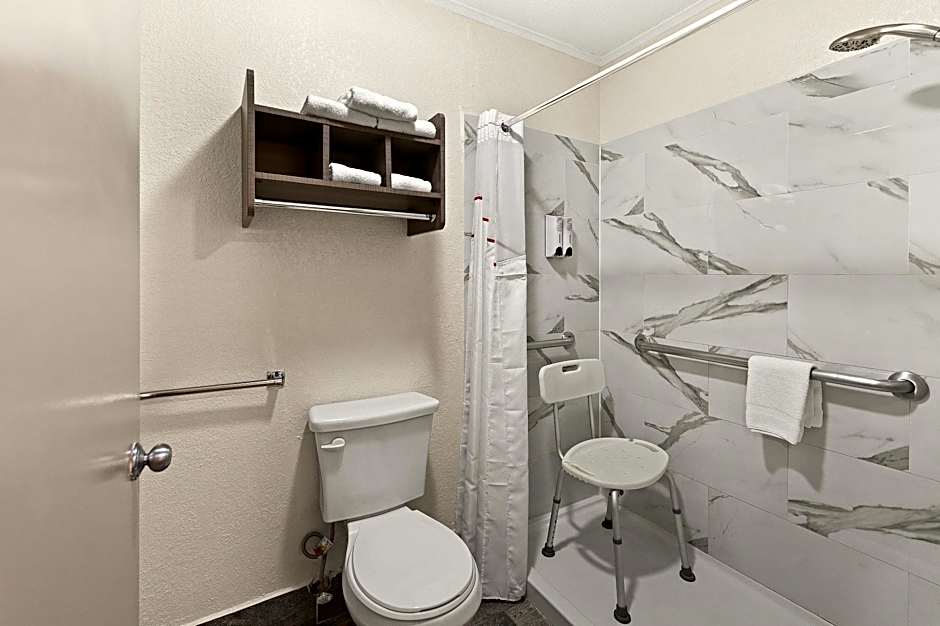 The Red Roof Inn Nacogdoches offers various types of rooms including superior king non-smoking, deluxe king room smoking, deluxe king room non-smoking, king room disability access/roll-in shower non-smoking, deluxe room with two double beds non-smoking, and deluxe room two double beds disability access/roll-in shower non-smoking. The rooms range in size at 280 sqft and can accommodate either 2 or 4 adults. Smoking is allowed in some rooms while non-smoking options are available as well.
