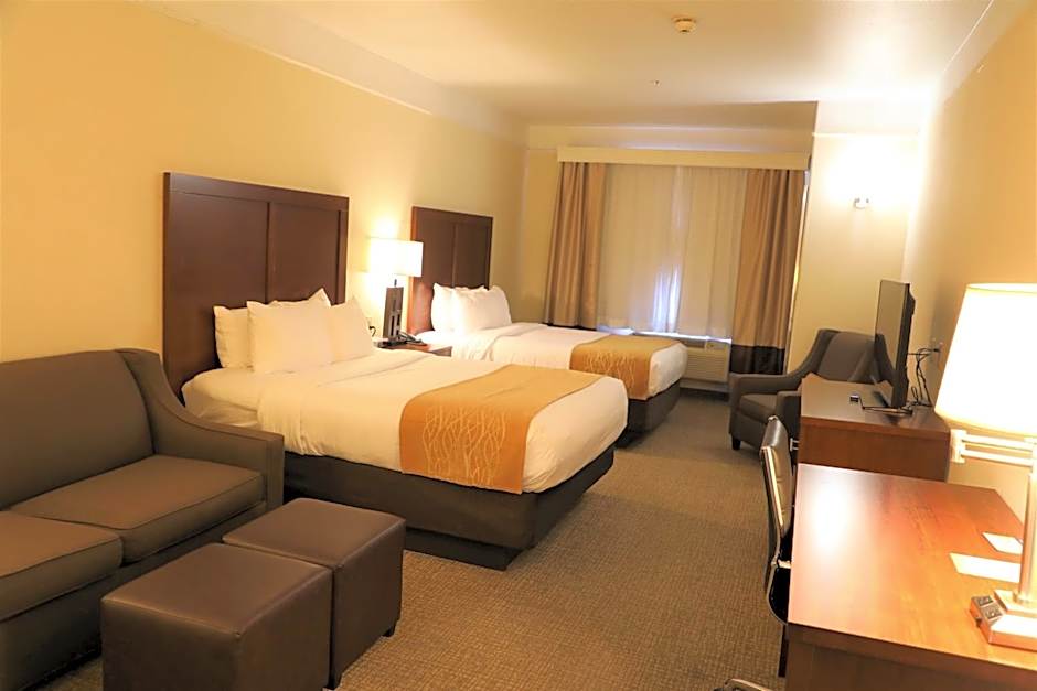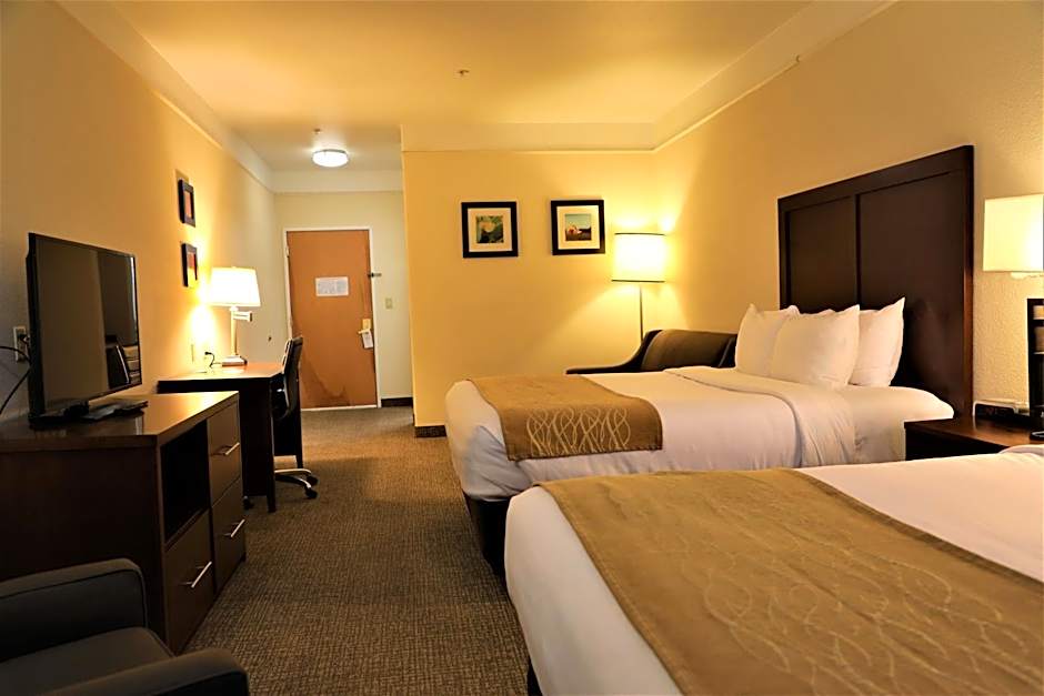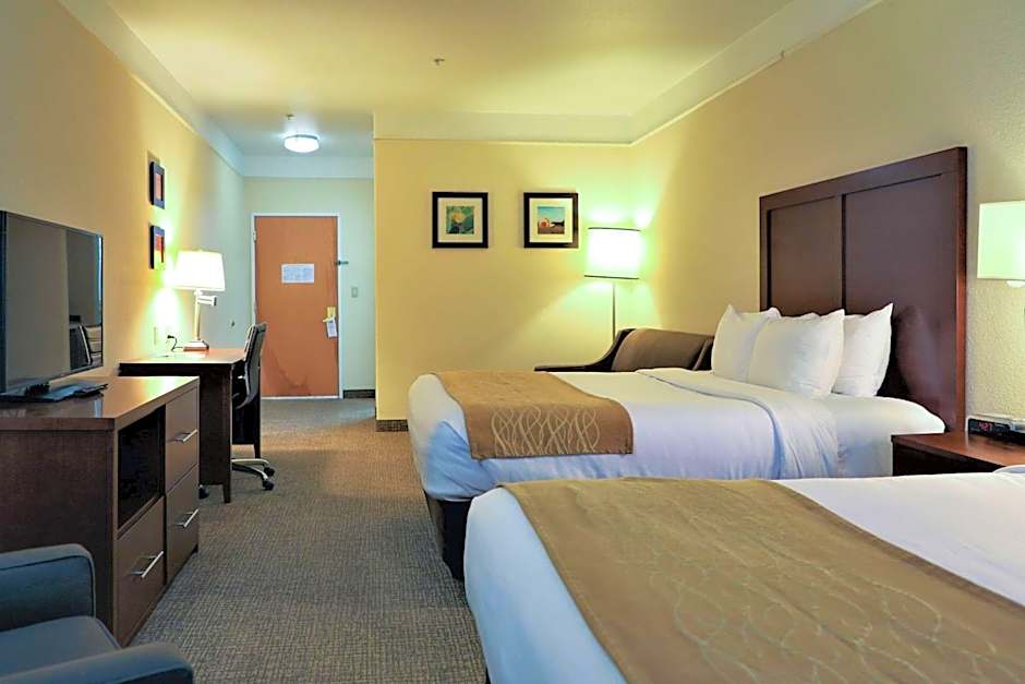 The Comfort Inn and Suites Odessa offers a variety of room types, including queen suites with two queen beds (accessible/non-smoking), king suites (non-smoking), king rooms (non-smoking), and a queen suite with two queen beds and a roll-in shower (accessible/non-smoking). All rooms are 377 square feet in size and do not allow smoking. The occupancy ranges from 2 adults and 1 child for the king room to 6 adults and 4 children for the queen suite with two queen beds.