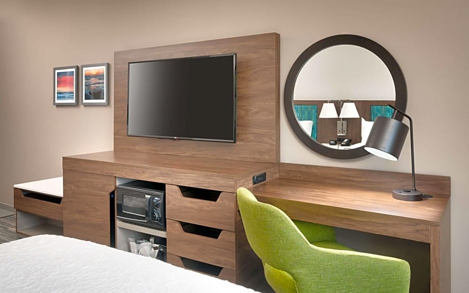 Free WiFi, 42-inch HDTV, easy chair with ottoman, work desk, coffeemaker, shower This spacious non-smoking guest room features a king-sized clean and fresh Hampton bed®, a comfortable easy chair with ottoman, and a 42-inch HDTV. Catch up on work at the large desk, or surf the web with free WiFi access. Refresh in the bathroom which has a WaterPik showerhead and curved shower rod that allows more light and space in the shower.