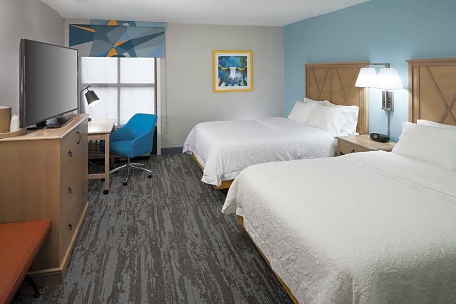 Any corresponding photo may not reflect the specific accessible room type or room feature. This hearing accessible, non-smoking room features two queen-sized beds. The room also has a visual alarm and notification devices for the doorbell or door knock and incoming phone calls. The room features our luxurious clean and fresh Hampton bed, comfortable soft seating, a HDTV, and easy to operate alarm clock/radio. In the bath you will enjoy a WaterPik showerhead and curved shower rod. The free high-speed internet access will help you stay connected while on the road. If you prefer not to work at the desk, you can use the convenient lapdesk instead. You'll also enjoy the convenience of having a coffee maker with tea service and iron/ironing board in your room.