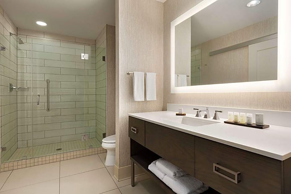 The hotel offers different types of suites, including Queen Suites with Two Queen Beds, Standard King Suites, King Suites with Sofa Bed, King Suites with Hearing Access, King Suites with Roll in Shower and Mobility Access, Queen Suites with Mobility Access, and Queen Suites with Hearing Access. All rooms are non-smoking and vary in size from 441 sqft to 700 sqft. The rooms can accommodate between 4 to 5 adults and 3 to 4 children, with bed sizes ranging from Queen size to King size.