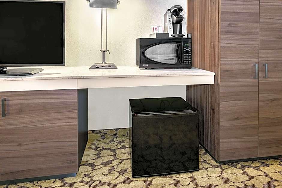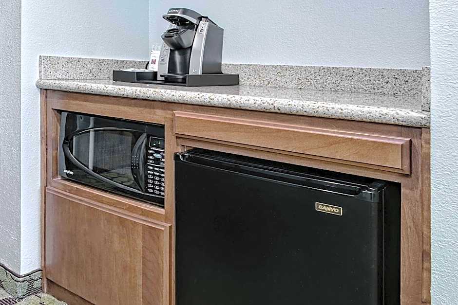 A refrigerator, microwave and coffee machine are included with this room. A flat-screen cable TV is also available.