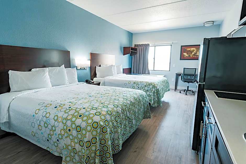 Non-Smoking Efficiency 2 Queen Bed(s) is 54 square feet and includes 2 queen-size beds 150-154 width plus desk.