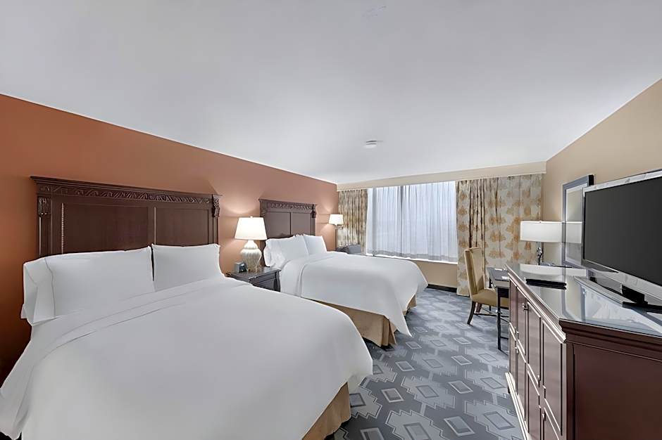 The hotel offers several types of rooms, including Deluxe Queen Rooms with Two Queen Beds, Deluxe King Rooms, and Executive King Rooms with Sofa Beds. All rooms are non-smoking and can accommodate 2 adults and 1 child. The Deluxe Queen and Deluxe King rooms have a room size of 398 sqft, while the Executive King Room is slightly larger at 409 sqft. The Deluxe Queen Rooms have 2 queen size beds, the Deluxe King Rooms have 1 king size bed, and the Executive King Rooms have 1 king size bed and 1 sofa bed.