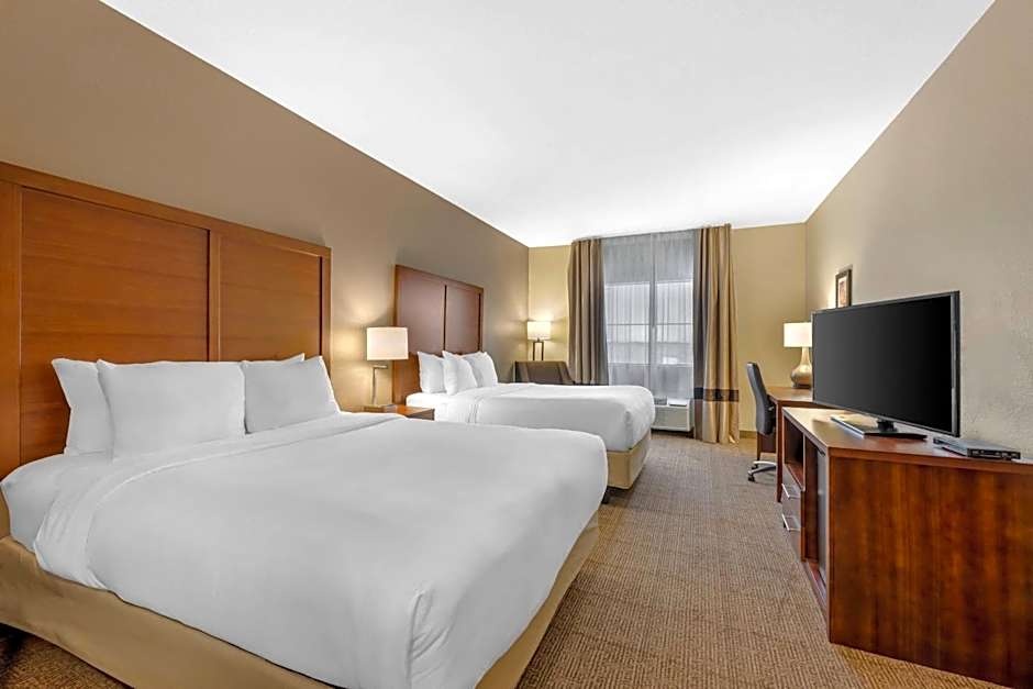 The Comfort Inn I-20 Midland Stanton offers a variety of room options. These include King Rooms with Roll-In Showers, Queen Rooms with Two Queen Beds, and regular King Rooms. All rooms are non-smoking and accommodate a maximum of 2 adults and 1 child, except for the Queen Rooms with Two Queen Beds which can accommodate up to 4 adults and 3 children. The bed sizes range from a King size bed to two Queen size beds.