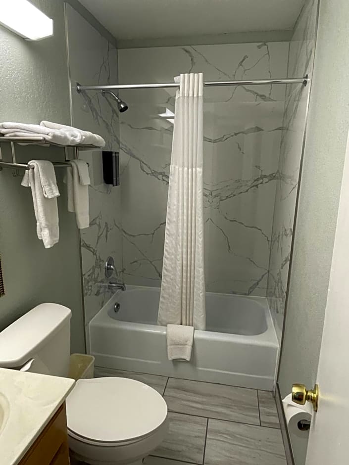 Very cute,Clean,liked the No carpet fact. Bathroom was very clean and liked the soap,shampoo,wall dispensers. So convenient. The bed were very comfortable and nice selection of pillows. Nice to have a small frig to use. Would stay again if in the area. It’s a Mom/Pop style stay which is so great sometimes to not be in a Chain hotel.